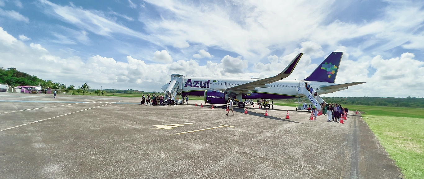 Localizado no continente, capaz de receber aviões de grande porte, com a estrutura de apoio para voos privados e comerciais. Da porta do avião à recepção do resort são alguns minutos, e as bagagens são encaminhadas diretamente, com todo o conforto. Para a praticidade dos hóspedes, ainda há a possibilidade de pouso em Ilhéus, com transfers diários oficias do resort.